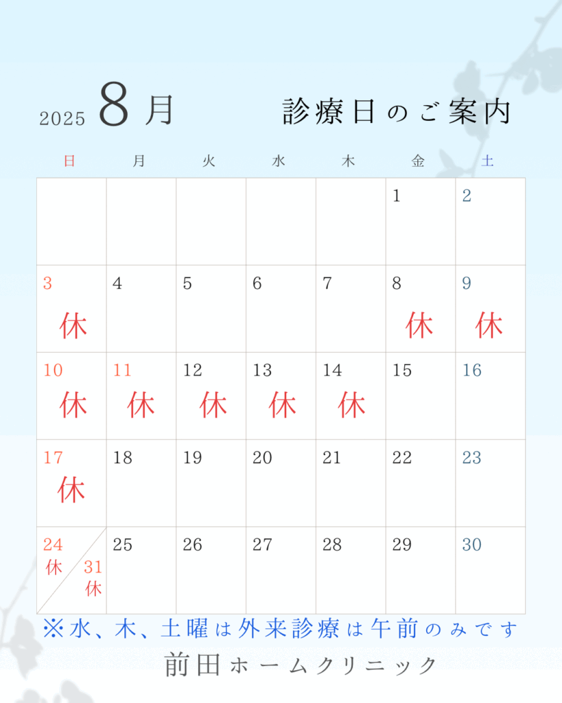 2025年8月8日(金)〜14日(木)休診です 2025.08.03 最終更新日時 : 2025.08.03 前田ホームクリニック 8月の休診日のお知らせです。2025年8月8日(金)〜14日(木)お休みとなります。 皆様にはご不便をおかけしますがよろしくお願いします。 前田ホームクリニック川西市花屋敷1−5−18